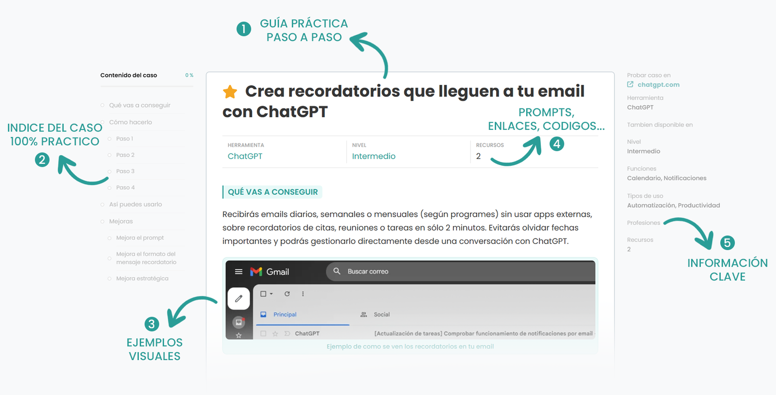 Son herramientas, prompts, enlaces y materiales adicionales que acompañan a cada caso de uso para que tengas todo lo necesario cuando quieras ponerlo en práctica.
