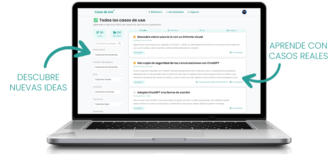 Dentro tienes una colección de casos reales para aprender a aplicar la IA con ejemplos claros y guiados